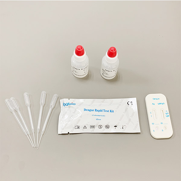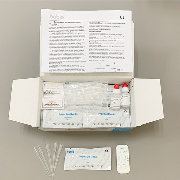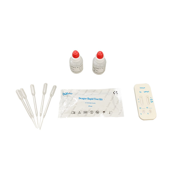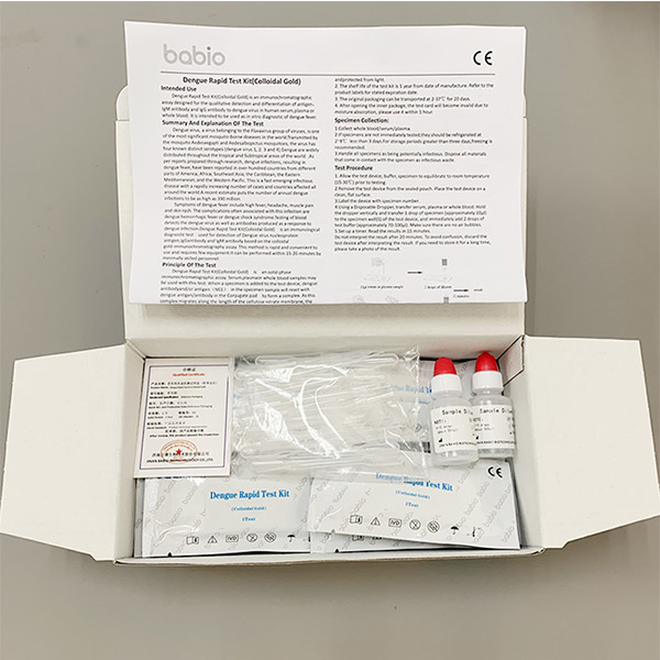 Dengue Rapid Test Kit (kolloidalt gull) er en immunokromatografisk analyse designet for kvalitativ deteksjon og differensiering av antigen , IgM -antistoff og IgG -antistoff til dengue -virus i humant serum, plasma eller fullblod.